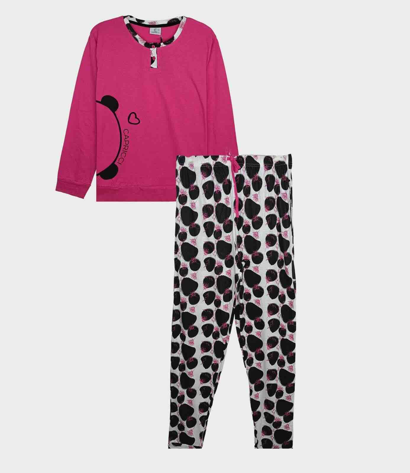 Ladies Printed Pyjama Sets. Long Sleeve Henley Neck Tops. Flat Knit Rib Sleeve Cuff and Bottom Hem. Printed. Elastic Waist Full Pant. Printed.